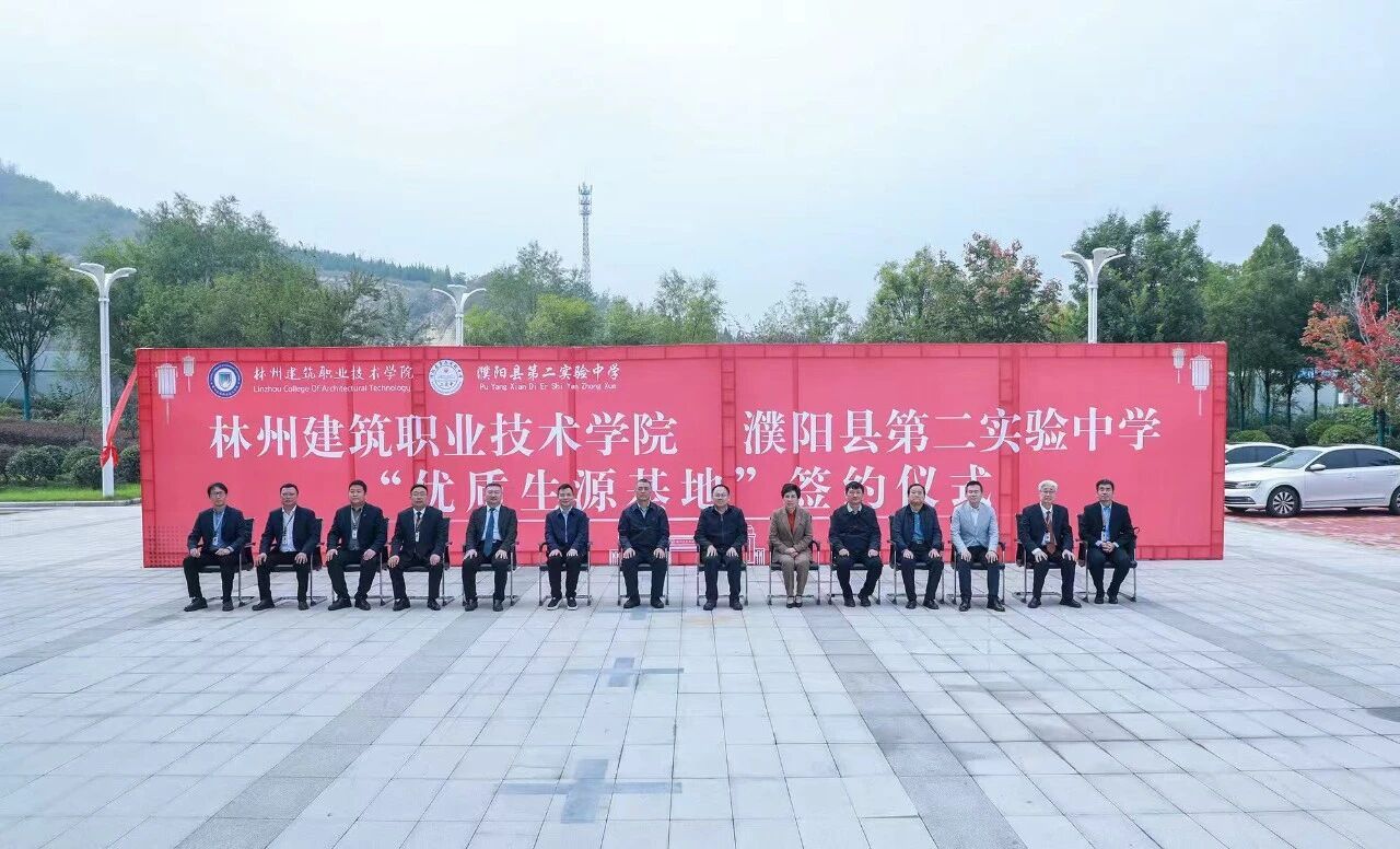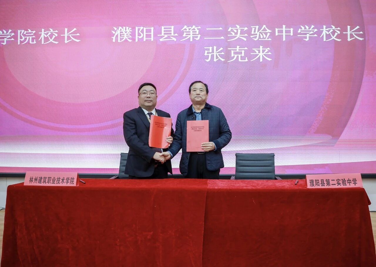会上,林州建筑职业技术学院校长张清华与濮阳县第二实验中学校长张克来签署合作协议,谷建光总裁与蔡玉坤董事长共同完成授牌。随后,全体参会人员合影留念,并参观了林州建院校园,实地考察了产教融合实训基地。