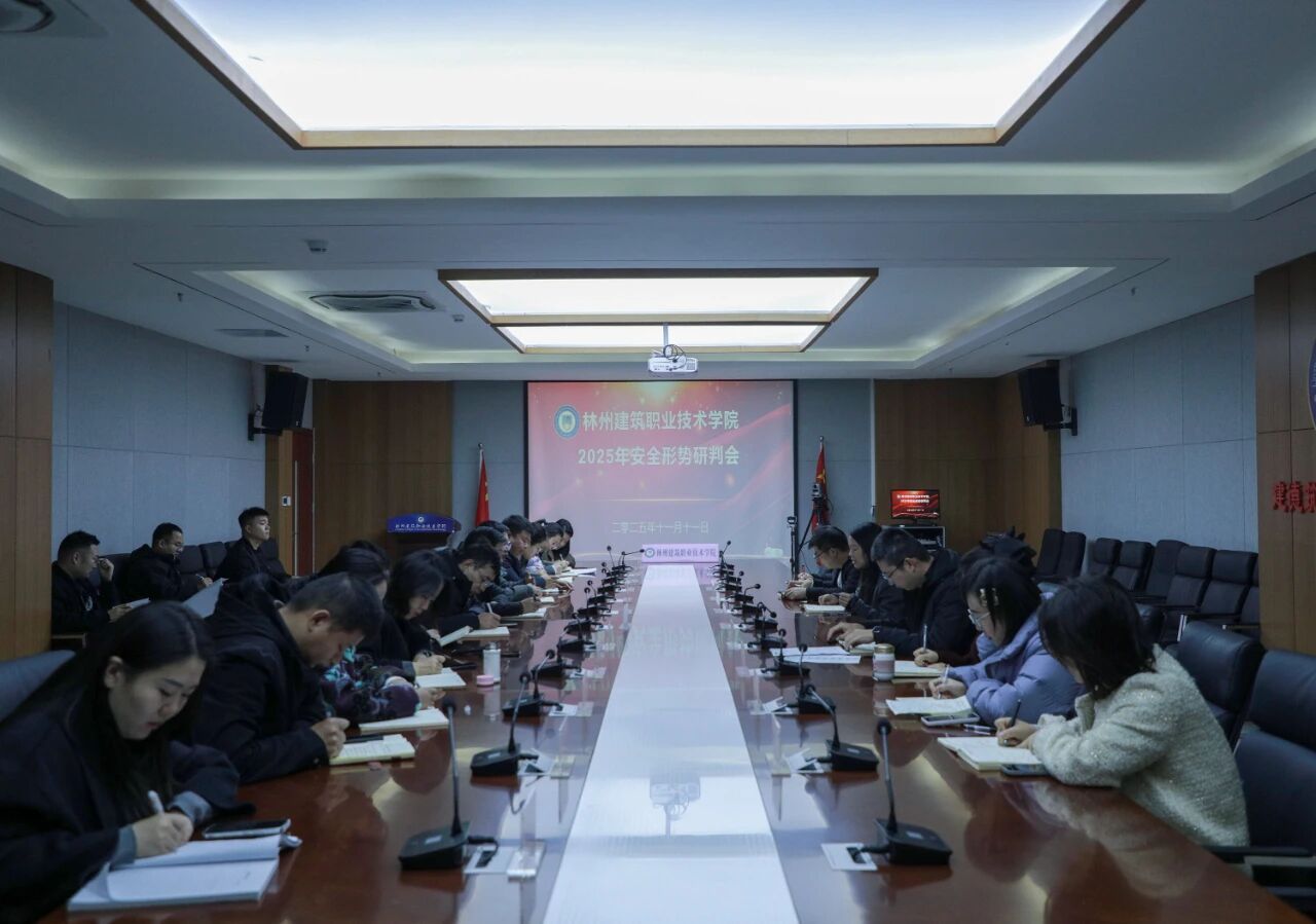2025年11月11日,林州建筑职业技术学院2025年安全形势研判会在行政楼211会议室召开。林州市桂园派出所驻林州建院三级警长王海涛,学校党委副书记、副校长郭鹏出席会议并部署近期重点工作,党务工作部、学生工作部、总务处及各相关服务单位负责人参会,共同研判校园安全风险,谋划全方位安全管理举措。