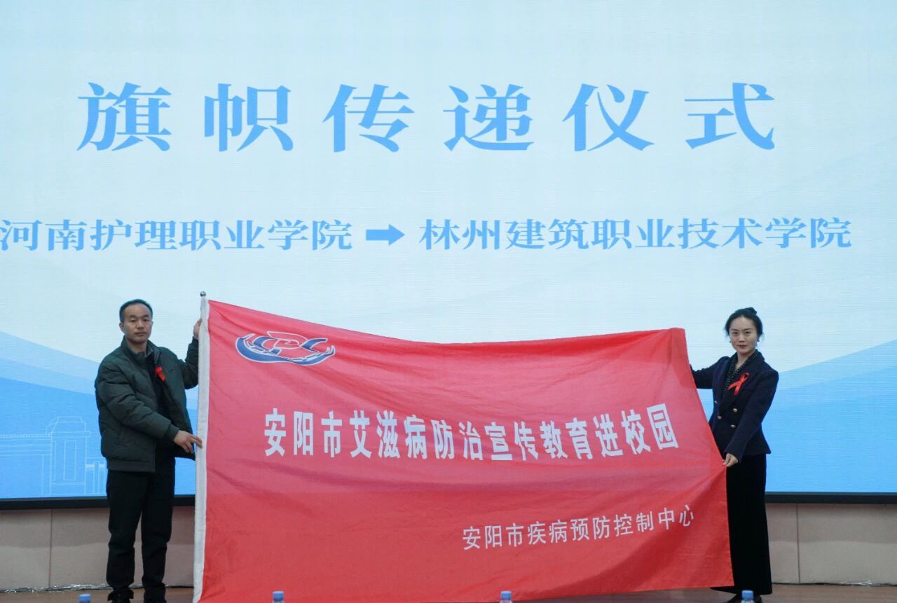 河南护理职业学院临床医学系副主任江雷振将象征着责任与使命的志愿服务队旗传递至我校学生工作部副部长牛予手中。这一传递仪式,标志着安阳市校园防艾宣传教育工作完成了又一次接力,象征着防艾志愿服务的使命与担当在我校正式延续。