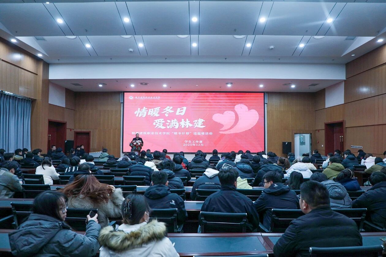 为深入贯彻落实国家资助政策,切实关怀家庭经济困难学生的学习和生活,传递学校的温暖与爱护,12月23日下午,林州建筑职业技术学院在行政楼报告厅举行“情暖冬日,爱满林建”暖冬计划送温暖活动。校党委副书记、副校长郭鹏出席活动。学生工作部各部门负责人,各学院学管副院长、分团委书记,全体辅导员及受助学生参加了本次活动。活动由学生工作部部长李帅主持。