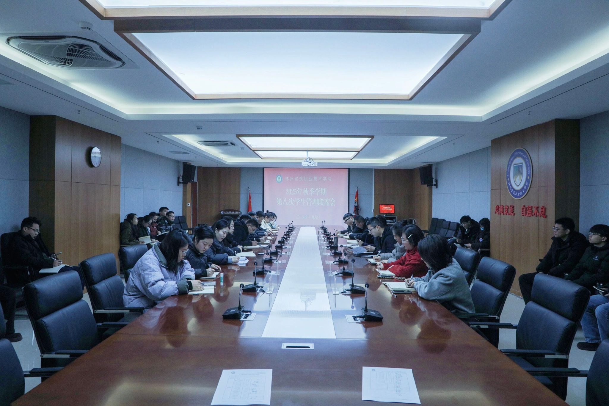1月6日上午,林州建筑职业技术学院在行政楼211会议室召开2025年秋季学期第八次学生管理联席会。校党委副书记、副校长郭鹏出席会议并讲话,党务工作部、学生工作部、总务处及相关服务单位负责人参加会议。会议由学生工作部部长李帅主持。