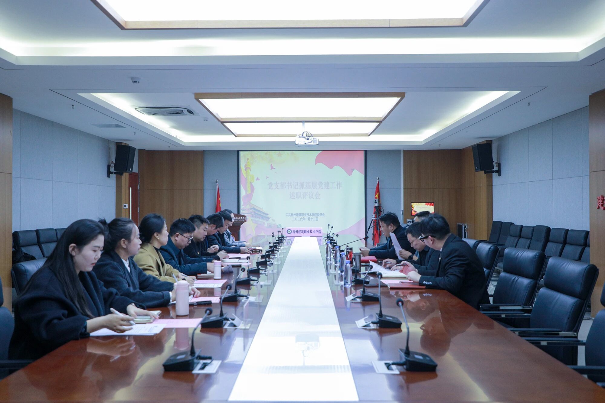 1月12日下午,林州建筑职业技术学院党支部书记抓基层党建工作述职评议会在行政楼211会议室隆重召开。会议集中检阅过去一年学校基层党建工作成效,全面考核党支部书记履职尽责情况,为各基层党组织搭建相互学习、交流借鉴、共同提升的平台。校长张清华出席会议并作总结讲话,党委副书记、副校长郭鹏对支部书记述职进行现场评议,会议由纪委书记、监事会主席赵伯程主持。